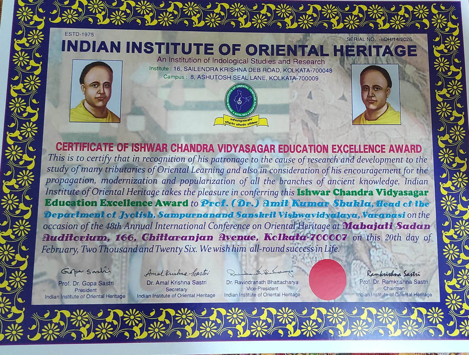 वाराणसी। इंडियन इंस्टीट्यूट ऑफ ओरियंटल हेरिटेज, कोलकाता द्वारा आयोजित 48वें वार्षिक अंतरराष्ट्रीय प्राच्य धरोहर सम्मेलन में सम्पूर्णानंद संस्कृत विश्वविद्यालय के ज्योतिष शास्त्र विभागाध्यक्ष प्रो० (डॉ०) अमित कुमार शुक्ला को ‘ईश्वरचन्द्र विद्यासागर शिक्षा उत्कृष्टता सम्मान’ से अलंकृत किया गया। यह गरिमामय समारोह 20 फरवरी 2026 को महाजाति सदन ऑडिटोरियम, कोलकाता में संपन्न हुआ।