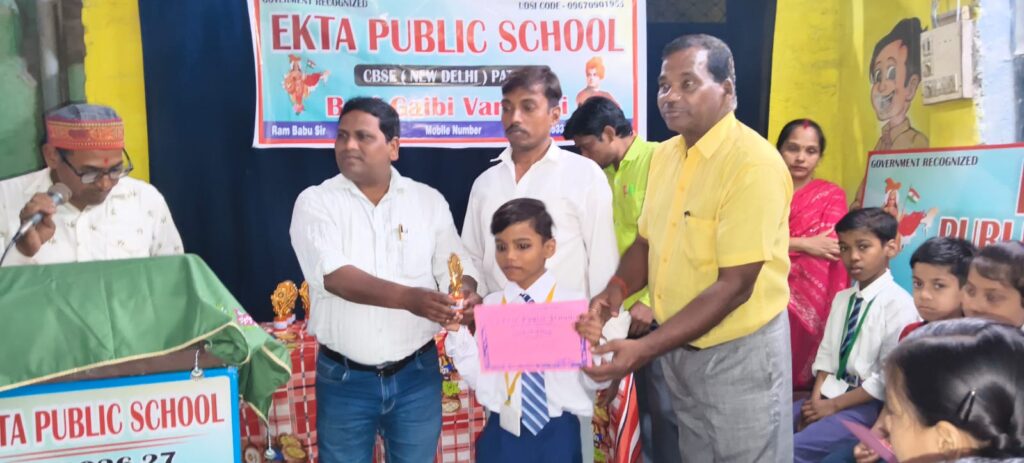 एकता पब्लिक स्कूल के कक्षाओं में प्रथम, व्दितीय, तृतीय स्थान प्राप्त करने वाले छात्र छात्राओं को अंकपत्र, मेडल, स्मृति चिन्ह देकर सम्मानित किया गया।कक्षाओं में सर्वोच्च स्थान प्राप्त करने वाले छात्र छात्राओं क्रमश: प्री नर्सरी अफजल अली 68.92,अबू ज़ुबर 68.3, अहमद रजा 53%‌।एल के जी युसरा 84.2, मुबारक अली 75.5, प्रिंस सहानी 69.8%यू केजी आलिया परवीन 75.2, लक्ष्य श्रीवास्तव 72.64, सीजारुल 70% ,कक्षा एक हसरत तहरीन 62.5, छोटू कुमार सोनकर 49.8, अंशु मौर्या 48.9%।कक्षा दो आयुष गुप्ता 54, नैतिक सोनकर 45, जाहन्वी सोनकर 44.9%।कक्षा तीन खुशनुमा परवीन 80.3, अंचल कुमारी 68.9, तौसीफ 64.9%,कक्षा चार प्रकाश आफरीन 62,सोनी सोनकर 56.4% आयुषी सोनकर52.6%,कक्षा पांच संस्कार सोनकर 73, अनोखी, महेंद्र सोनकर 51.%कक्षा छह विशु कुमार 48.8,अकह 62.4, नसीब रज़ा 58.7%कक्षा सात संसा सोनकर 67.7, अकोह 62.4, नसीफ रजा ने 58.7%‌ प्राप्त किया।