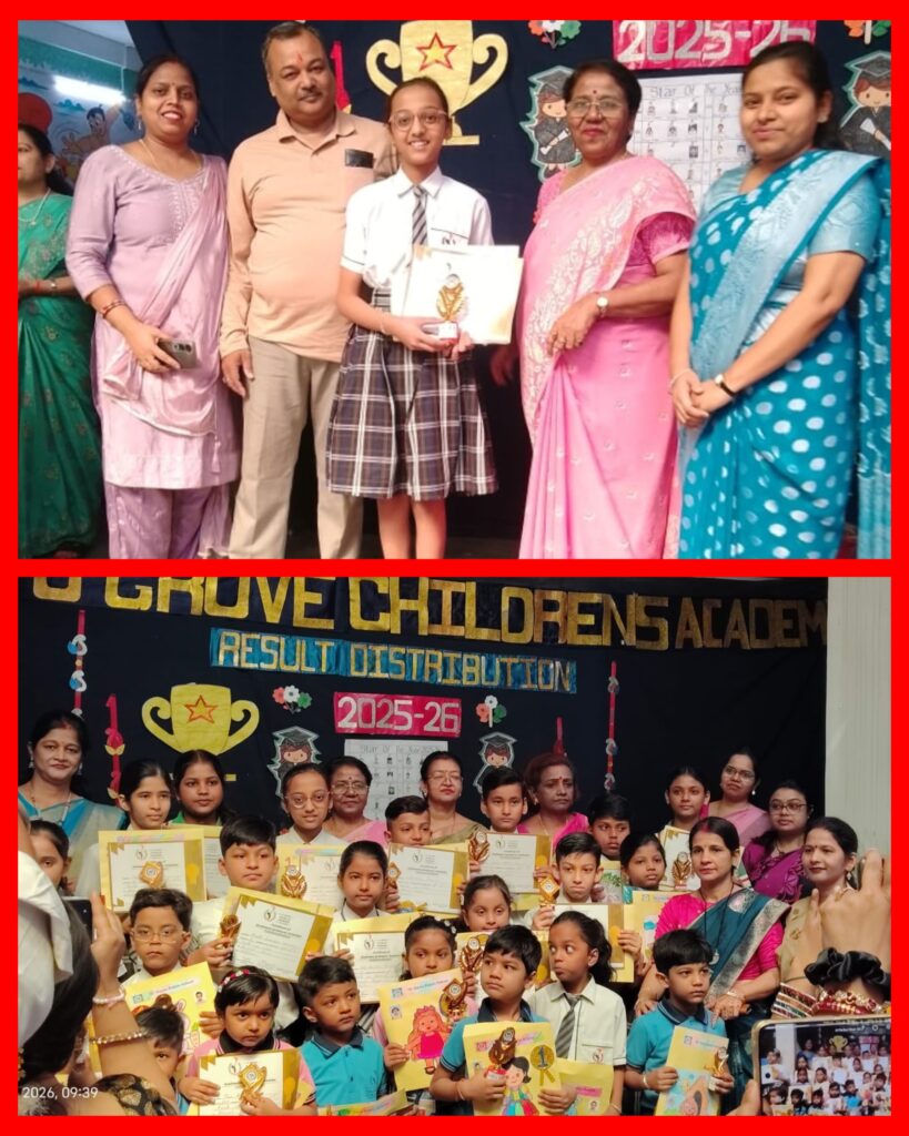वाराणसी। दिनांक 30 मार्च 2026, सोमवार को विनायका स्थित ओ ग्रोव चिल्ड्रेन अकादमी में सत्र 2025-26 के परिणाम वितरण समारोह का आयोजन उत्साह एवं गरिमामय वातावरण में सम्पन्न हुआ। इस अवसर पर कक्षा 6 की छात्रा वृद्धि श्रीवास्तव ने 95.6% अंक प्राप्त कर प्रथम स्थान प्राप्त किया। वहीं रिया मिश्रा ने 89.0% अंकों के साथ द्वितीय स्थान तथा आलिया बतूल ने 86.0% अंक प्राप्त कर तृतीय स्थान हासिल किया।